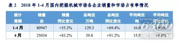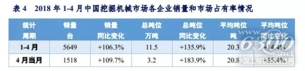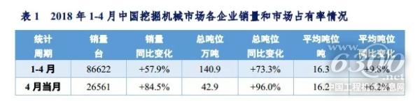 根據(jù)中國(guó)工程機(jī)械工業(yè)協(xié)會(huì)挖掘機(jī)械分會(huì)統(tǒng)計(jì)數(shù)據(jù),2018年1-4月納入分會(huì)統(tǒng)計(jì)的25家主機(jī)制造企業(yè)銷(xiāo)售情況如表1所示。1-4月銷(xiāo)量同比漲幅超過(guò)50%,市場(chǎng)持續(xù)高增長(zhǎng)。平均噸位大幅提高,說(shuō)明中、大挖市場(chǎng)占比持續(xù)提升。2018年1-4月銷(xiāo)量接近2011年歷史極值,創(chuàng)造歷史同期第二高銷(xiāo)量。