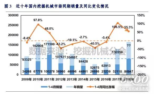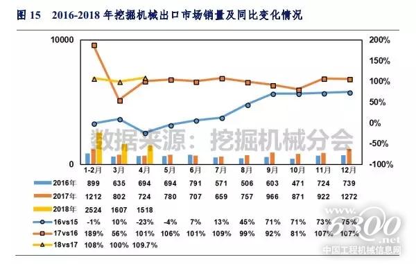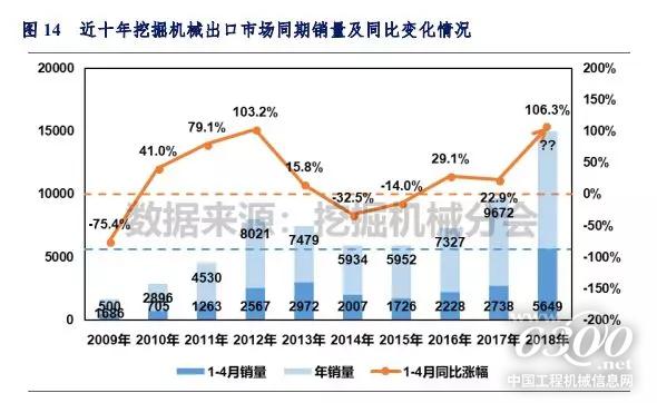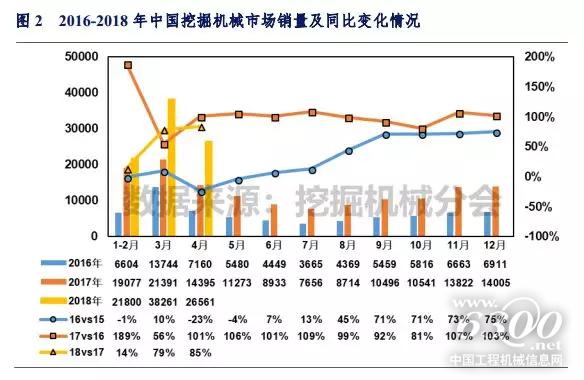中國(guó)挖掘機(jī)械市場(chǎng)自2016年下半年進(jìn)入高速增長(zhǎng)通道,9月至12月連續(xù)四個(gè)月漲幅超過(guò)70%,2017年增長(zhǎng)勢(shì)頭更加強(qiáng)勁,全年銷(xiāo)量接近翻番增長(zhǎng)。進(jìn)入2018年以來(lái),在高基數(shù)基礎(chǔ)上,行業(yè)保持穩(wěn)健高速增長(zhǎng)態(tài)勢(shì)。