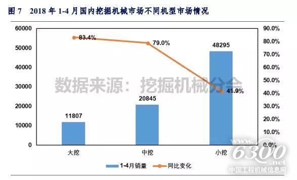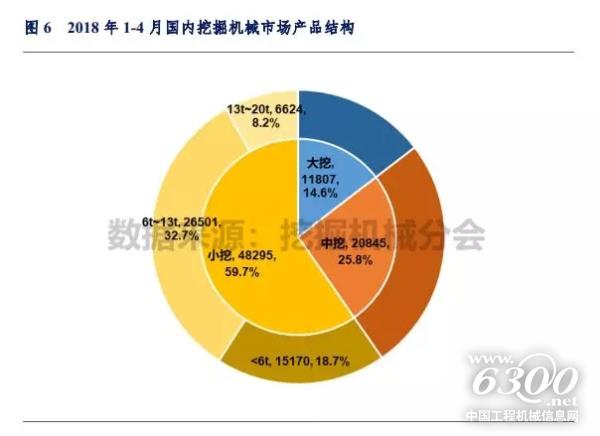 2018年1-4月大挖、中挖、小挖銷(xiāo)量分別為1100、2362和2187臺(tái),市場(chǎng)份額分別為19.5%、41.8%和38.7%。其中6噸以下迷你挖銷(xiāo)量和6~13噸小挖銷(xiāo)量分別為825和907臺(tái),市場(chǎng)份額分別為14.6%和16.1%。