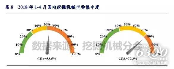 2018年1-4月國(guó)內(nèi)挖掘機(jī)械市場(chǎng)集中度CR4=53.5,CR8=77.3,相比3月市場(chǎng)集中度有所上升(前值CR4=52.5,CR8=77.0)。其中,大挖、中挖、小挖CR4市場(chǎng)集中度分別為57.3%、51.8%和53.9%,CR8市場(chǎng)集中度分別為81.9%、77.7%和77.6%。