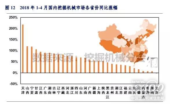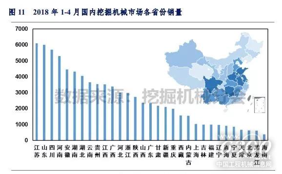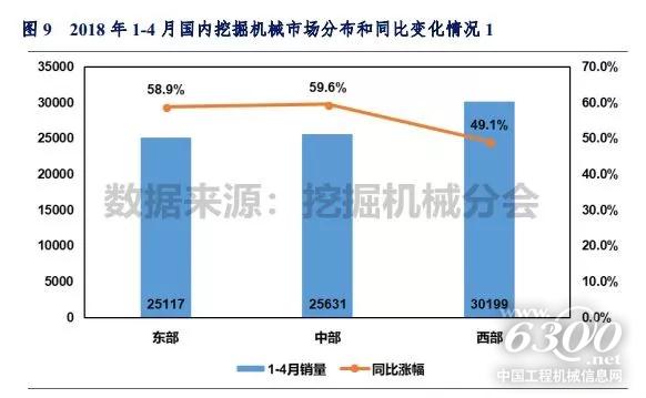 2018年1-4月東部、中部、西部地區(qū)挖掘機(jī)械銷(xiāo)量分別25117、25631和30199臺(tái),同比漲幅分別58.9%、59.6%和49.1%。