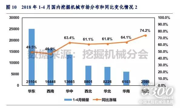 2018年1-4月華東、西南、華中、西北、華北、華南和東北地區(qū)挖掘機(jī)械銷(xiāo)量分別25104、16448、13665、8801、8228、6103和2598臺(tái),同比漲幅分別49.5%、46.9%、63.4%、61.1%、61.8%、64.1%和74.2%。