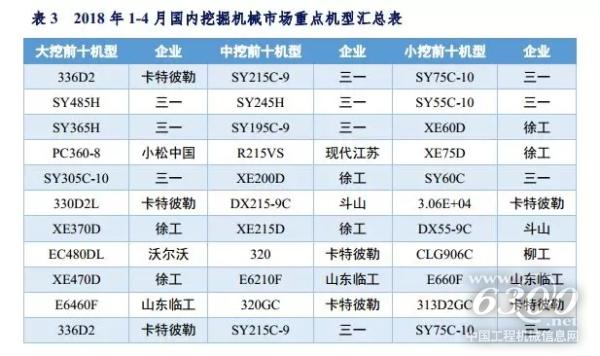 2018年1-4月,國(guó)內(nèi)不同規(guī)格挖掘機(jī)械銷(xiāo)量前十機(jī)型如下表所示。大挖市場(chǎng)主要被卡特彼勒、三一壟斷,國(guó)內(nèi)品牌在小挖市場(chǎng)的競(jìng)爭(zhēng)力更強(qiáng)。