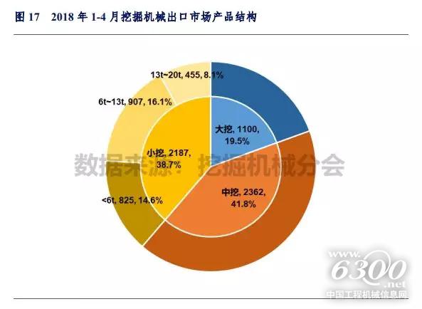 2018年1-4月國(guó)內(nèi)大挖、中挖、小挖銷(xiāo)量分別為11807、20845和48295臺(tái),市場(chǎng)份額分別為14.6%、25.8%和59.7%。小于6噸的微挖和6~13噸范圍的小挖占據(jù)國(guó)內(nèi)約一半的市場(chǎng)份額。從不同規(guī)格產(chǎn)品銷(xiāo)量變化看,大挖、中挖和小挖銷(xiāo)量同比增加5369、9203和14265臺(tái),漲幅分別83.4%、79.0%和41.9%。從近三年產(chǎn)品結(jié)構(gòu)變化看,大挖、中挖復(fù)蘇顯著,小挖市場(chǎng)份額稍有下滑。