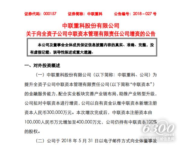 6月6日晚間,中聯(lián)重科發(fā)布公告,公司將向全資子公司中聯(lián)重科資本有限責任公司(以下簡稱“中聯(lián)資本”)增資30億元人民幣。同時,中聯(lián)資本擬出資30億元與北京君來資本管理有限公司合作設立中聯(lián)產業(yè)基金,投資方向將聚焦公司的戰(zhàn)略主業(yè)領域。公司預計,本次增資完成后,中聯(lián)資本金融服務能力將得到進一步提升,助力中聯(lián)重科完善全產業(yè)鏈布局,加快實現(xiàn)戰(zhàn)略主業(yè)升級。