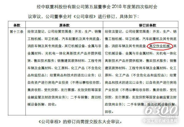 當晚,中聯(lián)重科還披露了董事會對《公司章程》的修改內容。公司表示,因業(yè)務發(fā)展的需要,公司擬在經營范圍中增加“高空作業(yè)機械”。此舉表明中聯(lián)重科正在加快部署新業(yè)務。