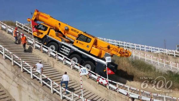 所有的靜態(tài)檢查以及演示都已結(jié)束,XCA60E以近乎完美的答卷結(jié)束了靜態(tài)檢查項(xiàng)目。接下來(lái)面臨的,也是目前全球行業(yè)內(nèi)全地面起重機(jī)從未進(jìn)行過(guò)的“極限挑戰(zhàn)”——60%坡道爬坡驗(yàn)證,這也是某些越野汽車(chē)的爬坡極限,而今天用戶將要求它在來(lái)自中國(guó)徐工的起重機(jī)上實(shí)現(xiàn)。測(cè)試內(nèi)容是司機(jī)將駕駛XCA60_E通過(guò)坡度為60%(折合角度為31°)的試驗(yàn)坡道。這考驗(yàn)的不僅是車(chē)輛的爬坡能力,還考驗(yàn)車(chē)輛的駐坡能力、縱向穩(wěn)定性、車(chē)輛通過(guò)性,即使歐美制造商也尚未開(kāi)展如此大角度的實(shí)際爬坡驗(yàn)證。