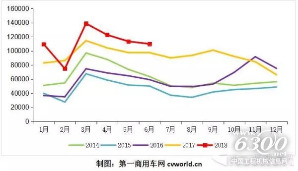 2014-2018年上半年重卡市場月度走勢圖
