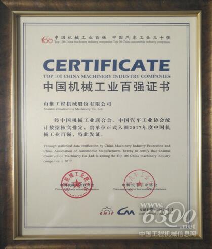 2018年7月14日,由中國(guó)機(jī)械工業(yè)聯(lián)合會(huì)、中國(guó)汽車工業(yè)協(xié)會(huì)主辦的第十四屆“中國(guó)機(jī)械工業(yè)百?gòu)?qiáng)、汽車工業(yè)三十強(qiáng)企業(yè)信息發(fā)布會(huì)”在山東臨沂市召開。會(huì)上發(fā)布了2017年中國(guó)機(jī)械工業(yè)百?gòu)?qiáng)企業(yè)名單,山推工程機(jī)械股份有限公司以全年穩(wěn)健上升的經(jīng)營(yíng)業(yè)績(jī),居第49位,比2016年上升6位。