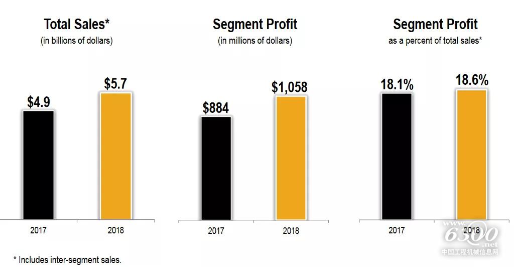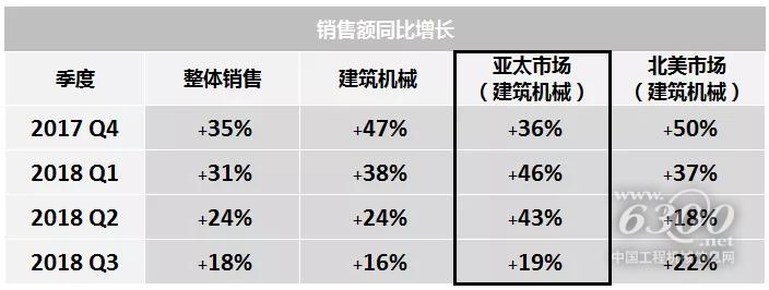 建筑機(jī)械(Construction Industries)板塊第三季度銷售表現(xiàn):整體銷售額達(dá)到57億美元,同比增長16%。利潤情況同比增長20%,利潤率達(dá)到18.6%。