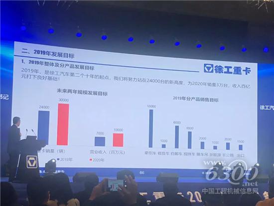 2019年是徐工汽車第二個十年的起點,面對市場挑戰(zhàn)和機遇,2019年,徐工重卡目標銷售各類重卡23600輛(相當于同比增長30%以上),營業(yè)收入達70億元,為2020年實現(xiàn)“銷量3萬輛,收入百億元”的“十三五”目標奠定良好基礎。其中,牽引車目標銷售10000輛,自卸車目標銷售6000輛,載貨車目標銷售1000輛,攪拌車目標銷售4600輛,隨車吊目標銷售2000輛。