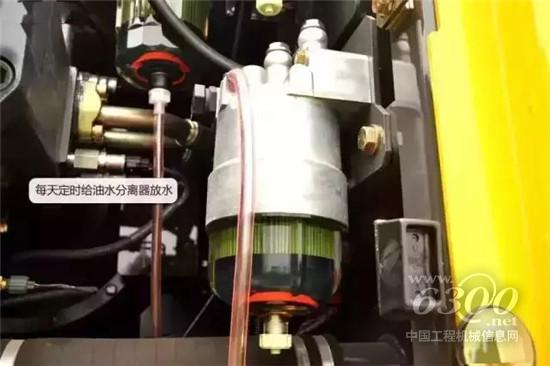 一般的油水分離器下面都有一個透明的塑料材質(zhì)的積水杯,在使用油水分離器的時候一定要注意及時放水,積水太多油水分離器也就起不到油水分離的作用了。尤其在挖掘機(jī)加滿燃油后,更需要進(jìn)行排水。一般油水分離器處有燃油開關(guān),此時帶上手套,關(guān)閉燃油開關(guān),打開排水口后擰開燃油開關(guān),將積水杯內(nèi)的水排干為止。這個過程看似簡單卻很容易被忽略。