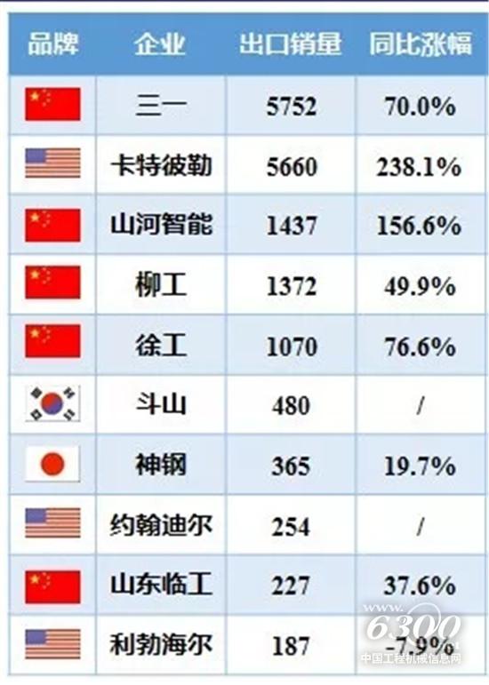 出口數(shù)據(jù):2018年納入統(tǒng)計的25家主機制造企業(yè)共計出口銷量為19100臺,同比漲幅97.5%,占總銷量的9.39%。根據(jù)2018年1—11月的挖機出口數(shù)據(jù),三一、卡特、山河智能分別占據(jù)出口銷量的前三位。