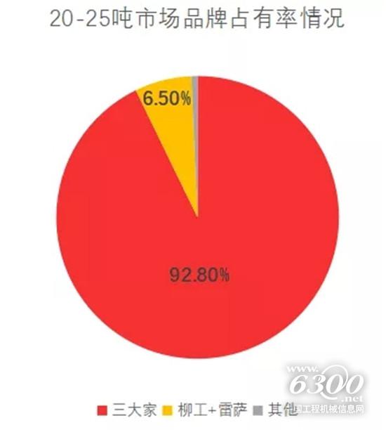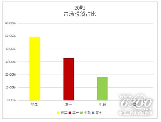 目前,20噸級(jí)三大家占比達(dá)到99.9%,其他品牌銷售不足20臺(tái)。三分天下中,徐工占比48.9%依舊接近半壁江山,剩下的市場(chǎng)份額被三一接近33%和中聯(lián)18%幾乎完全瓜分。