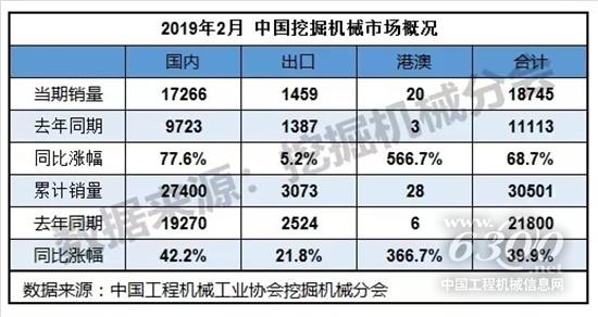 挖掘機1-2月銷量合計30501臺,同比漲幅39.9%。國內(nèi)市場銷量(統(tǒng)計范疇不含港澳臺)27400臺,同比漲幅42.2%。如此可觀的市場銷量,有的機友甚至表示:2019年前兩個月的挖機銷量相當(dāng)于2013年全年的一半!