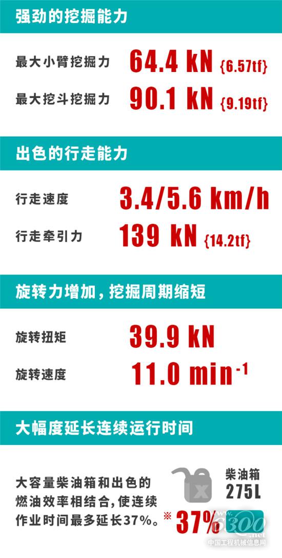 依托三大科技技術(shù):新液壓系統(tǒng)、新一代電子控制發(fā)動機、ITCS系統(tǒng),追求強勁高效的作業(yè)效率的同時,有效減少不必要的燃油損耗,實現(xiàn)了高性價比。