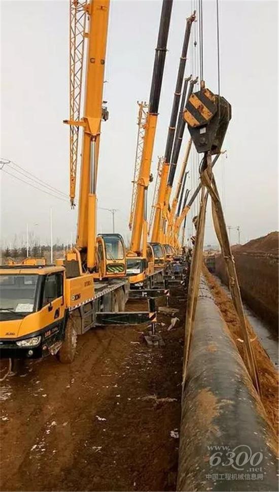 140米長的管道,10余臺(tái)徐工25噸起重機(jī)群集合力,每臺(tái)車吊裝4.5噸左右,伸出20多米大臂,半徑13米,助力沈陽渾南區(qū)燃?xì)夤艿拦こ探ㄔO(shè)。