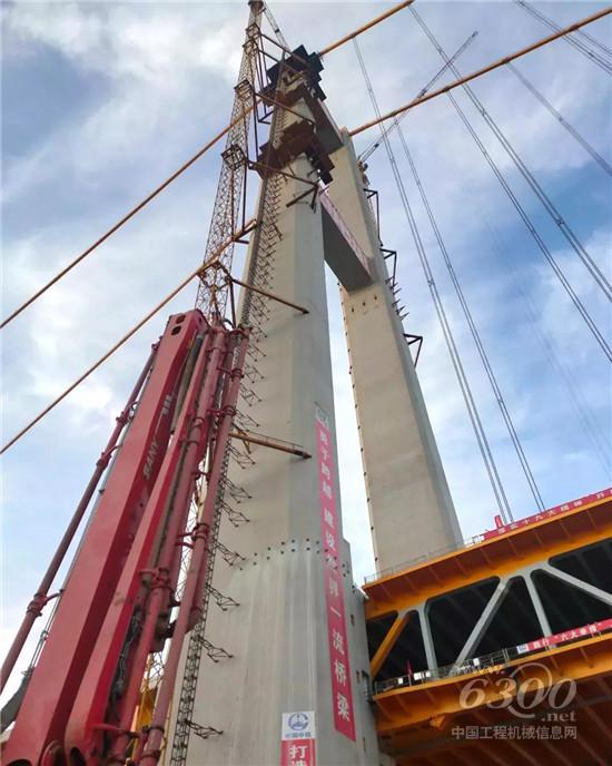 橋段塔柱的混凝土泵送是大橋施工中的難點。為此,三一研發(fā)人員為大橋量身訂做了2臺出口壓力為35兆帕的超高壓拖泵。施工中,三一“泵王”一次性泵送高度達到了240米,順利完成了主橋墩的泵送任務。