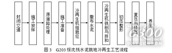 此技術可用于各等級公路瀝青路面的大修和改擴建工程,水泥就地冷再生層可用作道路的底基層或基層。此次青岡至安達路段的水泥就地冷再生層作為底基層使用,水泥添加量為4.5%,采用水泥撒布車撒布水泥。再生施工使用WR 250,再生施工過程遵循圖3所示流程。