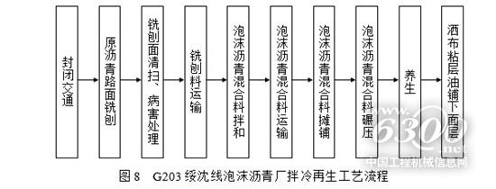 此次望奎路段的泡沫瀝青廠拌冷再生層作為下面層使用,水泥添加量為1.8%,泡沫瀝青用量為3.0%,發(fā)泡水用量為2.0%,外加水用量為1.2%。廠拌施工中采用了KMA 220再生設備,再生過程遵循圖8所示流程。