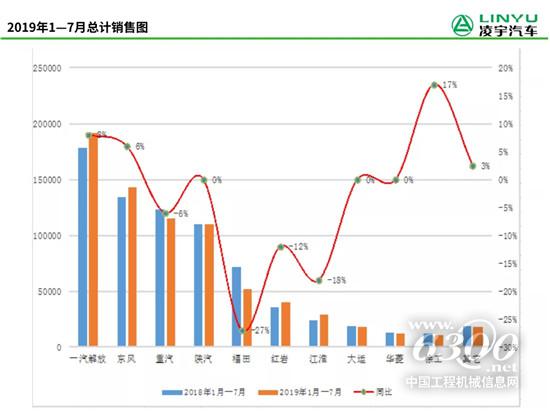 今年1—7月,我國重卡市場累計銷量73.23萬輛,同比去年的 74.64萬輛下降2%,小幅下滑。