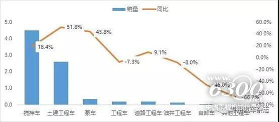 工程車銷量增速與國內固定資產投資增速呈正相關關系,2019年上半年受大量基建項目集中開工影響,工程車銷量同比大幅增長,尤其是攪拌車、泵車以及土建工程車,2019年1~6月銷量同比分別增長18.4%、43.8%、51.8%。