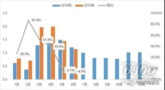 從月度銷量走勢來看,2019年1~4月,工程類專用車市場銷量保持較大幅度的增長,5月、6月隨著基建投資增速放緩以及行業(yè)“大噸小標”治理,終端客戶大多處于觀望狀態(tài),銷量同比出現下滑。