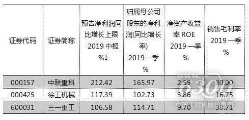 通過(guò)對(duì)工程機(jī)械板塊整體財(cái)報(bào)數(shù)據(jù)來(lái)看,其整體凈資產(chǎn)收益率與毛利率均已達(dá)到了近四年(2016~2019)一季度同期的最高值,2016年板塊整體凈資產(chǎn)收益率為-0.47%,2019年則提升至了4.27%,銷(xiāo)售毛利率則由2016年的-2.6%提升至2019的10.35%。此外,自2018年一季度以來(lái),工程機(jī)械已連續(xù)四個(gè)報(bào)告期出現(xiàn)70%以上的凈利增長(zhǎng)。而“三率”的持續(xù)改善,無(wú)疑離不開(kāi)頭部公司的“貢獻(xiàn)”。