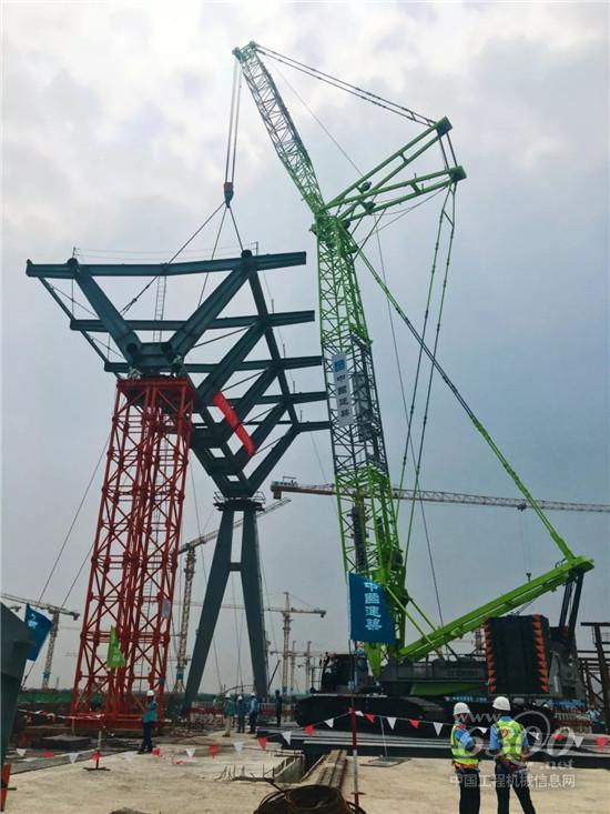 施工現(xiàn)場(chǎng),中聯(lián)重科ZCC3000履帶吊正在吊裝屋架鋼構(gòu)