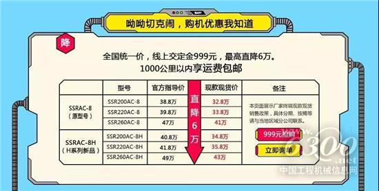 優(yōu)惠政策上,本次三一路面嗨購(gòu)節(jié),全線明星產(chǎn)品將擊穿底價(jià),直降六萬(wàn)元!全新H系列,實(shí)現(xiàn)以標(biāo)配底價(jià)享高配產(chǎn)品。經(jīng)典C8系列,更是絕版限量200臺(tái),售完即止。