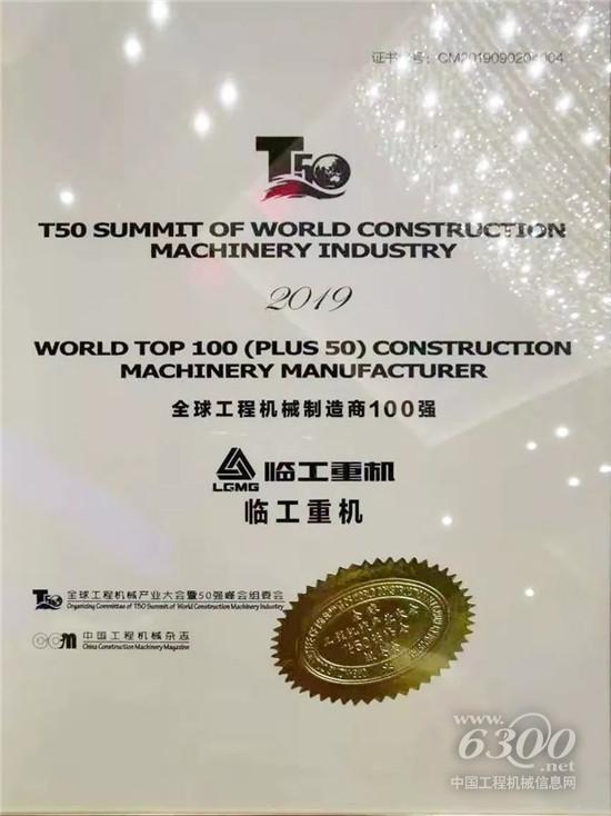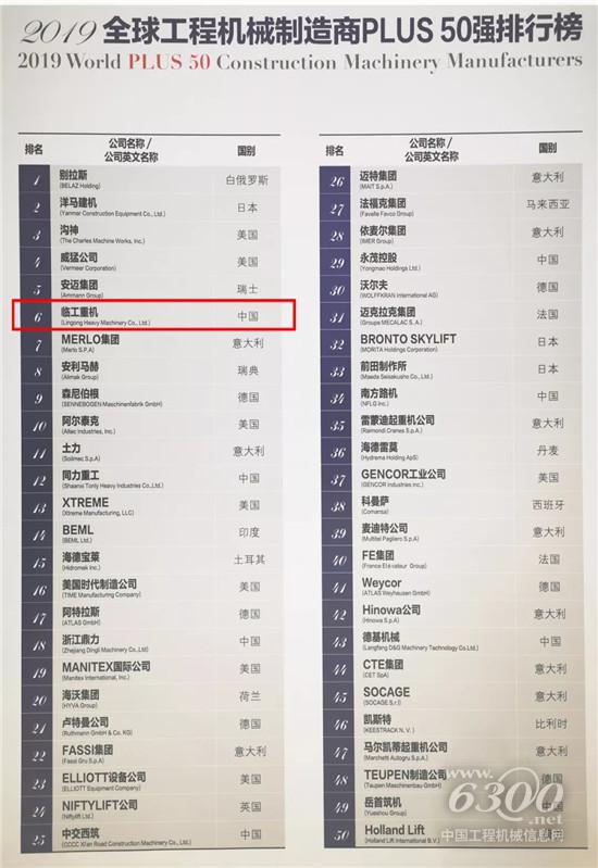 公司榮獲“2019全球工程機(jī)械制造商100強(qiáng)”(PLUS50強(qiáng),第6位,較2018年提升6個位次,位居中國品牌第1位)