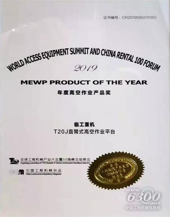 T20J直臂式高空作業(yè)平臺榮獲“2019年度高空作業(yè)產(chǎn)品獎”