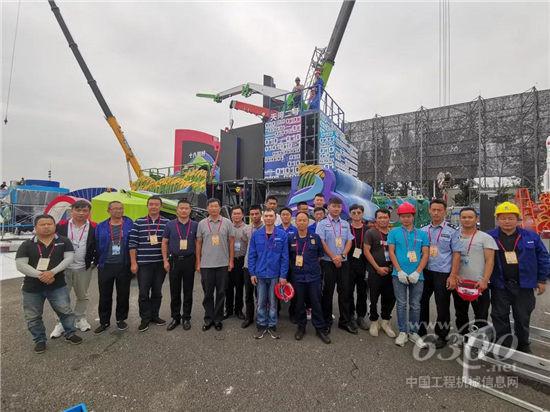 ▲湖南彩車轉(zhuǎn)場工人體育館后正在進行轉(zhuǎn)運組裝,中聯(lián)極光綠產(chǎn)品成為靚麗的風景線
