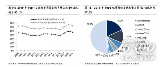 從行業(yè)集中度看,全球Top50租賃商設(shè)備保有量占比近一半。根據(jù)《Access International》數(shù)據(jù)統(tǒng)計,全球高空作業(yè)平臺租賃商前50強(qiáng)的設(shè)備保有量近五年復(fù)合增長率約8.82%,保持穩(wěn)健增長,2019年保有量達(dá)79.92萬臺,同比增長15.6%。從行業(yè)集中度看,全球高空作業(yè)平臺租賃商前50強(qiáng)約占全球租賃市場總保有量的一半。