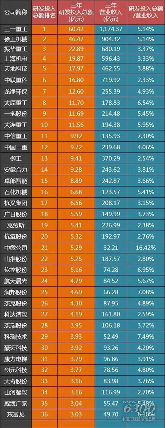 榜單對(duì)164家上市機(jī)械類企業(yè)近三年的研發(fā)投入進(jìn)行對(duì)比。近三年,三一重工以累計(jì)60.42億元的研發(fā)投入,高居行業(yè)榜首。三年研發(fā)投入總額在營(yíng)業(yè)收入中的占比達(dá)到5.14%。僅今年上半年,公司研發(fā)投入就高達(dá)11.89億元,同比2018年上半年的4.2億元暴增183.10%,主要用于加大對(duì)工程機(jī)械產(chǎn)品及關(guān)鍵零部件的研發(fā)投入。