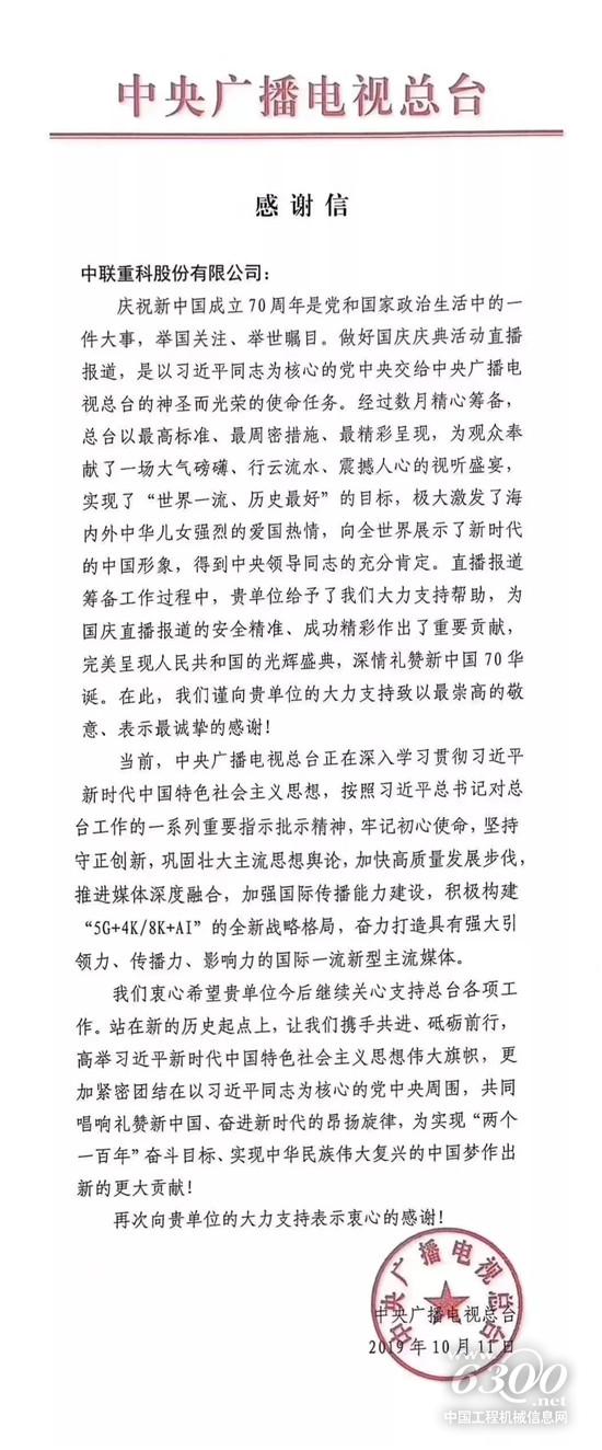 10月11日,中聯(lián)重科收到了來自中央廣播電視總臺的感謝信。央視在信中對中聯(lián)重科在此次慶典直播中所做出的貢獻表示了真摯的感謝,對這些幕后英雄產(chǎn)品也給予了極大的肯定。