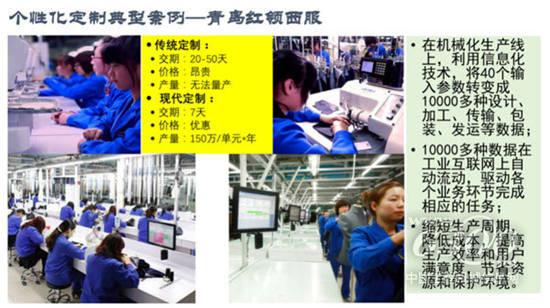 第四次工業(yè)革命是不是必須要一步步走呢?這是青島紅領(lǐng),大家看到的都是人工在那兒操作,只有一部機(jī)器,縫紉機(jī)是電動的,它是第一次工業(yè)革命的水平,但是它通過了信息化的手段把40多個參數(shù)變成一萬多個參數(shù),這一萬多個參數(shù)在工業(yè)互聯(lián)網(wǎng)上自由流動,這一流就變成個性化定制,時間縮短了,成本減少了,產(chǎn)量上去了,這時候別人也沒法跟他競爭,也就是說第一次工業(yè)革命的水平一步就跳到了第四次工業(yè)革命,這里面可能很多人不同意,它不叫智能制造,各有各的觀點。