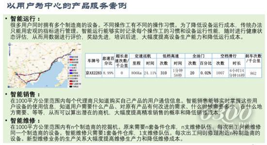 怎么尋找客戶?舉一個例子,從北京到沈陽,沿途司機(jī)踩了多少油門、多少次剎車,運輸過程中總共耗多少油,數(shù)據(jù)全部統(tǒng)計下來了,統(tǒng)計下來之后給老板,老板就知道100個員工中哪個省油,哪個費油,用數(shù)字說話,進(jìn)行培訓(xùn),于是整個耗油減少了50%,這50%是純利潤。用數(shù)據(jù)分析主動地為用戶提供服務(wù),這個用戶肯定就跑不掉了。