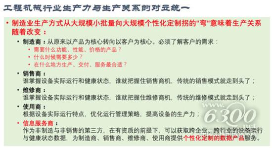 工程機(jī)械生產(chǎn)力和生產(chǎn)關(guān)系我是這么理解的:生產(chǎn)關(guān)系變了,不是盡量擴(kuò)大產(chǎn)能,降低生產(chǎn)成本,到市場上圈更大的地,而是變成要知道用戶需要什么,盡量的滿足,給用戶更好的產(chǎn)品。