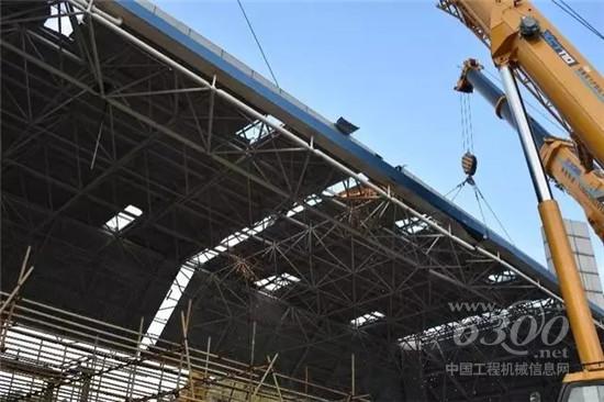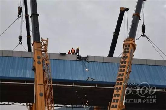 一側(cè)切割,分塊吊裝,根據(jù)兩側(cè)重量和壓力的懸殊,鄭國勝團(tuán)隊按照前期設(shè)計好的吊裝方案,300噸負(fù)責(zé)整體穩(wěn)定,一臺70和一臺40則負(fù)責(zé)仍在同行一側(cè)的穩(wěn)定、兩臺80噸用來穩(wěn)住切割線以內(nèi)的網(wǎng)架、兩臺110噸則負(fù)責(zé)吊裝已切割完成的網(wǎng)架,并將其平放路面,25噸則負(fù)責(zé)將拆解的網(wǎng)架裝車迅速運離現(xiàn)場。