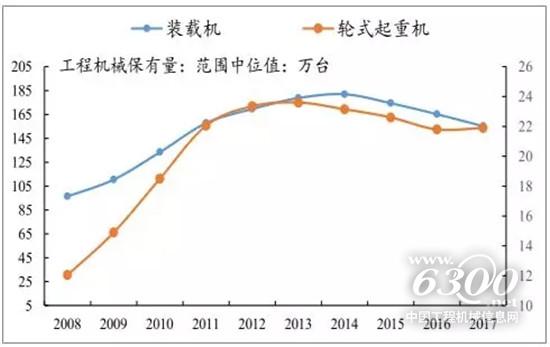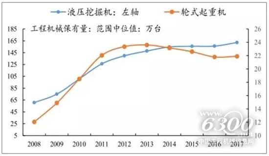 根據(jù)工程機(jī)械協(xié)會(huì)公布的工程機(jī)械保有量,截至2017年底,挖機(jī)和輪式起重機(jī)的保有量分別為155.7~168.6萬(wàn)臺(tái)和21~22.8臺(tái),根據(jù)歷年保有量范圍的中位數(shù),近年來(lái)挖機(jī)保有量保持緩慢增長(zhǎng),而起重機(jī)保有量甚至在2013年高點(diǎn)之后出現(xiàn)下滑。