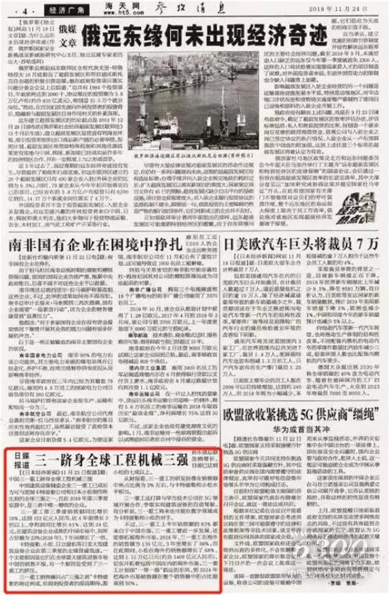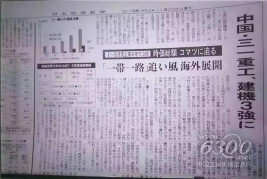 11月24日《參考消息》摘編了《日本經(jīng)濟(jì)新聞》報(bào)道:《中國(guó)三一重工躋身全球工程機(jī)械三強(qiáng)》,以下為主要內(nèi)容: