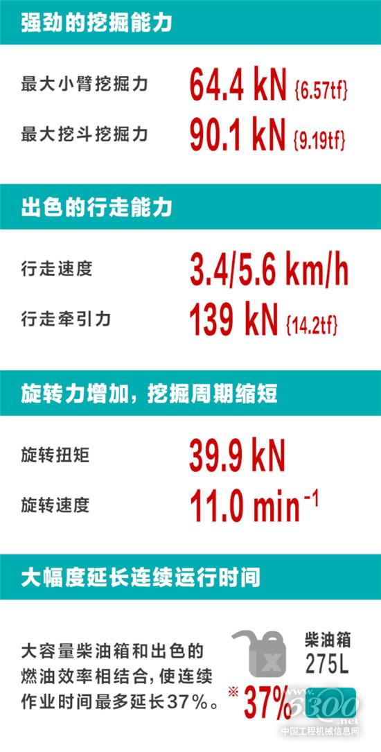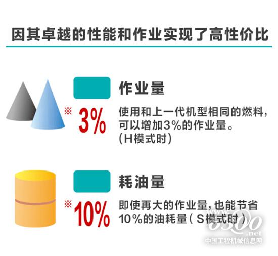 ●借助新液壓系統(tǒng)、ITCS系統(tǒng)、共軌式電子控制發(fā)動(dòng)機(jī)三大技術(shù),減少不必要的燃料及功率損耗,實(shí)現(xiàn)更低油耗。兩種作業(yè)模式輕松切換。選擇S檔模式優(yōu)先低油耗,適用一般作業(yè),重視省油的模式,相同作業(yè)時(shí)間內(nèi)油耗可降低10%。H檔模式,適用于追求速度的作業(yè)。