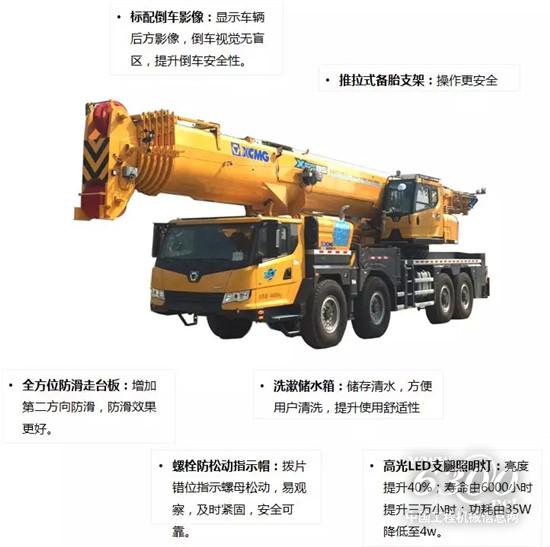 標配倒車影像、洗漱儲水箱、輪胎螺栓防松動指示帽;高光LED支腿照明燈,亮度提升40%,壽命提升五倍;副臂雙尖銷軸設計,穿軸更方便;鋁型材走臺板全方位防滑設計;一體式鑄造配重標識,吊裝作業(yè)更安全;全新設計上車攀爬扶梯配置,整機更加統(tǒng)一協(xié)調(diào),使用更加便捷,推拉式備胎支架,操作更安全、輕便。