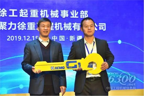 徐工起重機(jī)事業(yè)部總經(jīng)理助理、營(yíng)銷公司總經(jīng)理王萬才將QAY650A金鑰匙交付至新疆萬新吊裝公司