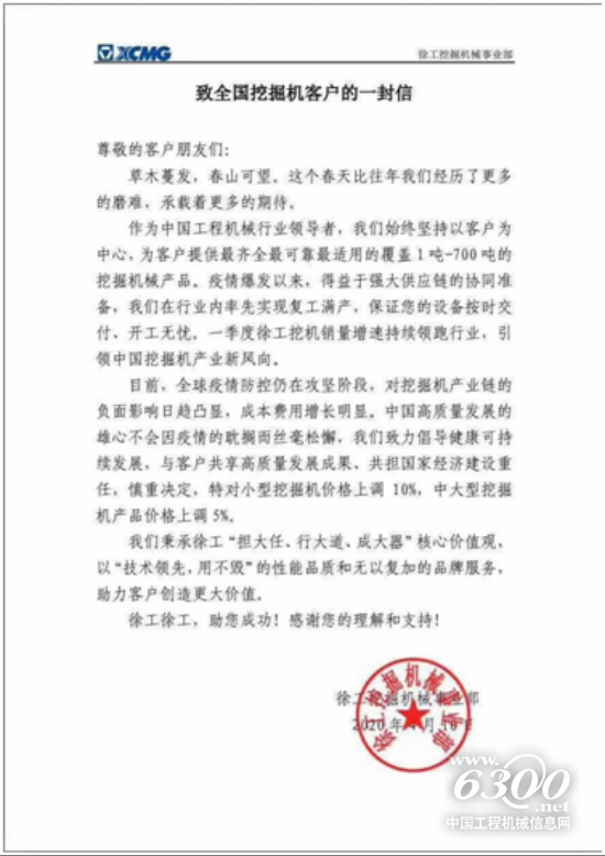 ?。?)4月10日,徐工挖掘機(jī)械事業(yè)部通知,徐工挖小挖掘機(jī)價(jià)格上調(diào)10%,中大挖價(jià)格上調(diào)5%。