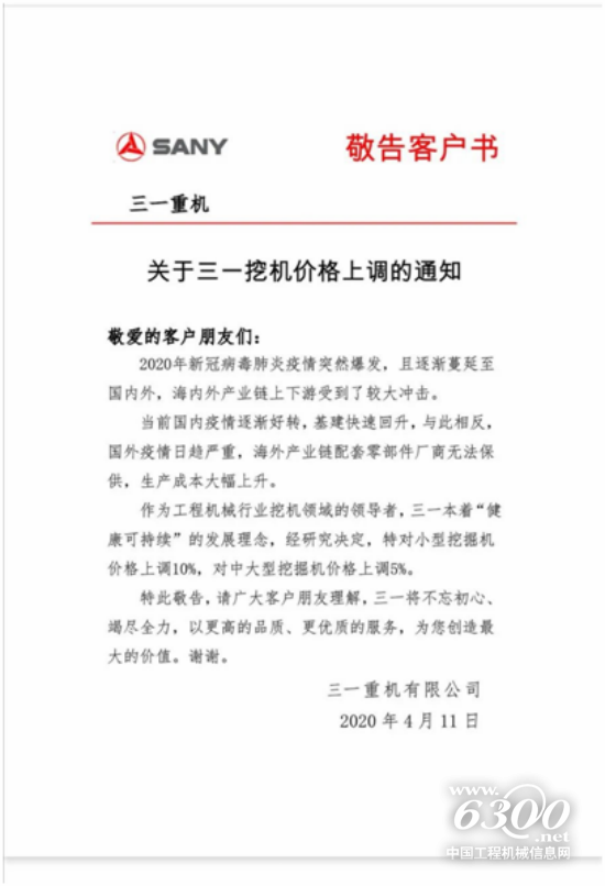?。?)4月11日,三一重機(jī)發(fā)布敬告客戶書(shū)——《關(guān)于三一挖機(jī)價(jià)格上調(diào)的通知》稱,其公司的挖掘機(jī)價(jià)格上調(diào),小挖上調(diào)10%,中大挖上調(diào)5%。