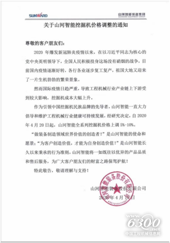 ?。?)4月13日,雷沃工程機(jī)械發(fā)布《敬告客戶書(shū)》,表示將對(duì)小型挖掘機(jī)價(jià)格上調(diào)10%,對(duì)中大型挖掘機(jī)價(jià)格上調(diào)5%。