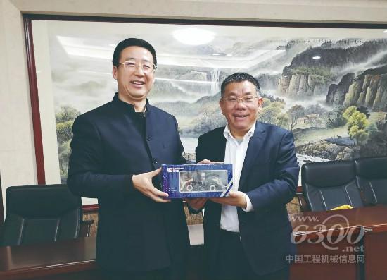 柳工集團(tuán)董事長曾光安(左二)向程冠軍(左一)贈(zèng)送柳工車模