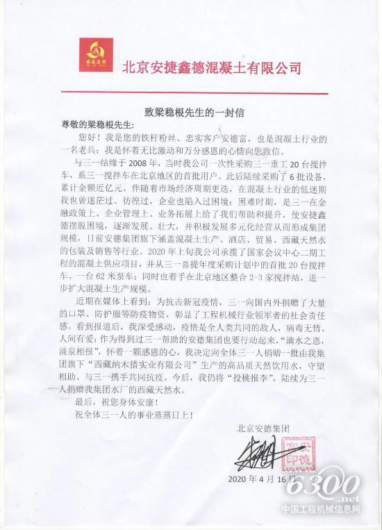 隨著防疫物資的投入使用及關(guān)懷政策的落地實施,三一也收到了來自社會各界發(fā)來的感謝信?!叭痪栀浟舜罅靠谡?、防護服等物資,彰顯了行業(yè)領(lǐng)軍者的社會責(zé)任感。”這是北京安德集團董事長安德富先生在感謝信中的一席話,也是對三一在抗疫行動中付出努力的肯定。